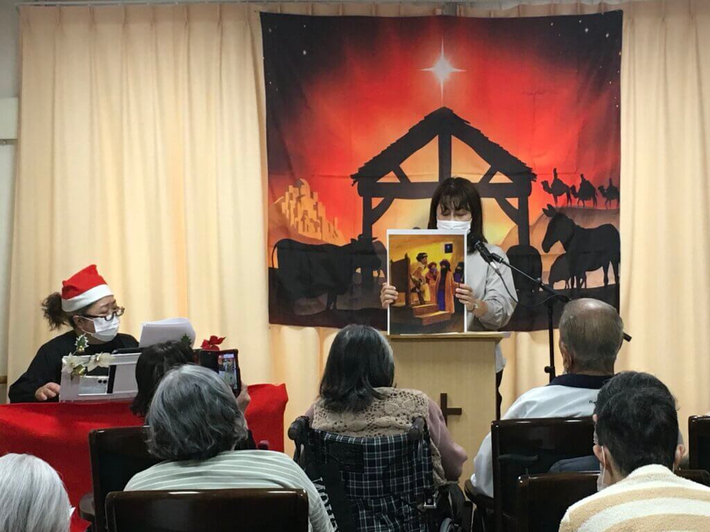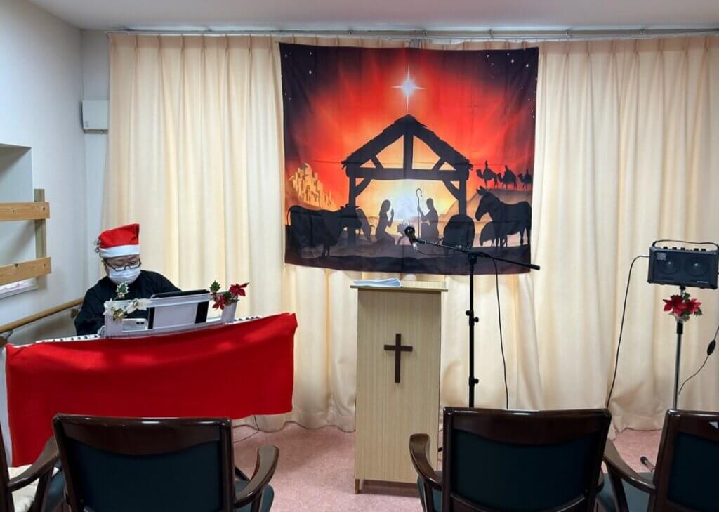 リモコン自動点灯式のキャンドル点火、そして最後にキャンドルの灯りで『きよしこのよる』を賛美しました。