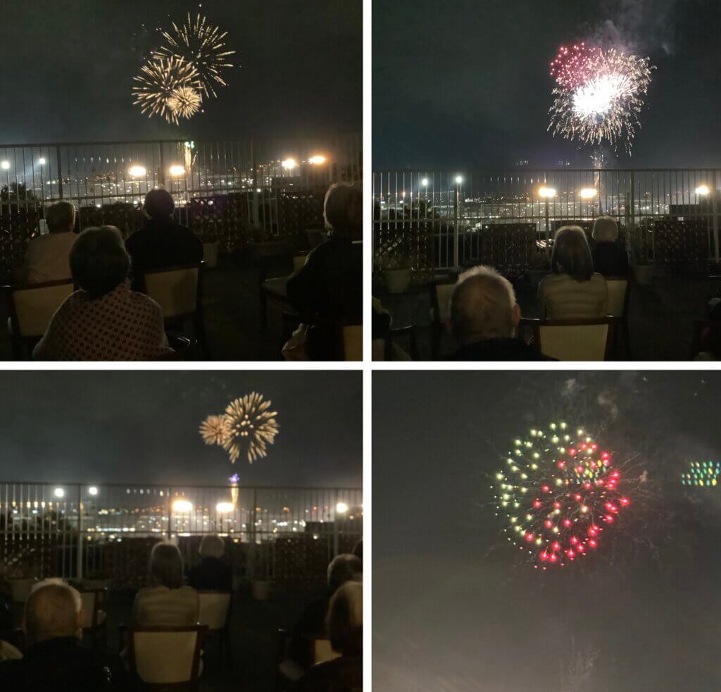 入居者様に、この花火を見て頂きたく夕食後、早速屋上へと誘導開始