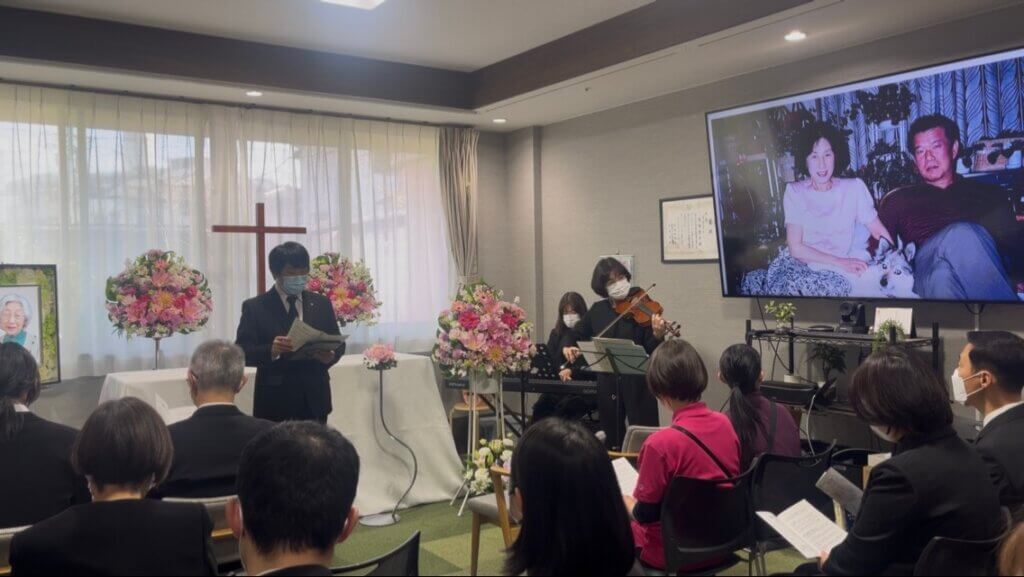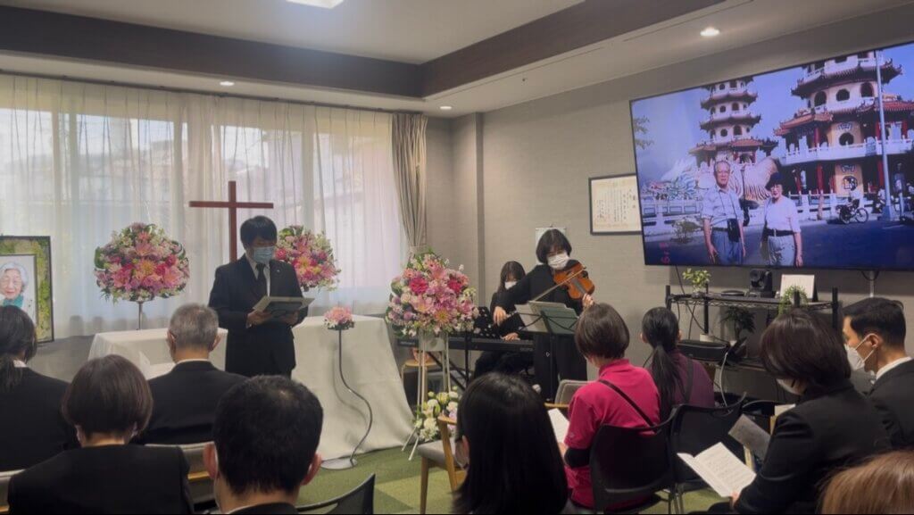 お世話になっていた施設 でチャプレンの司式のもと、賛美歌とメッセージで送って いただきました。スタッフさんもたくさん来てくださいま した。