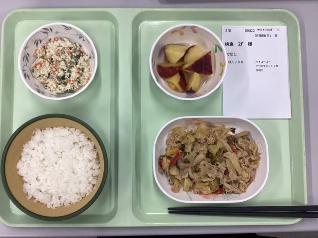 ・ホイコーロー、白和え、さつまいものレモン煮 (嚥下に合わせて食形態は個人差有り)