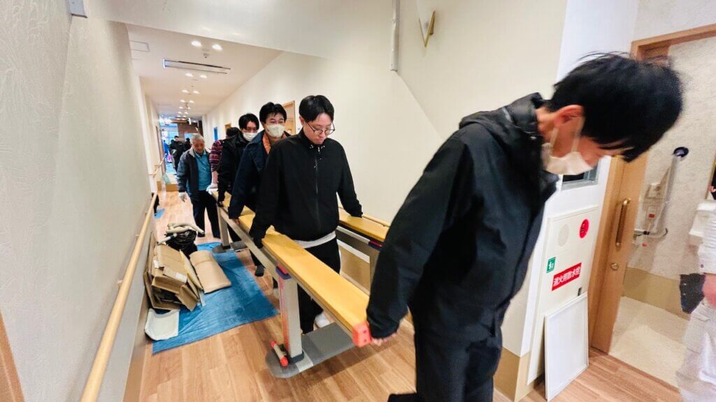 ・大切な平行棒はメンズ社員の若者がムカデ歩きで搬入🚶エッホ エッホ
