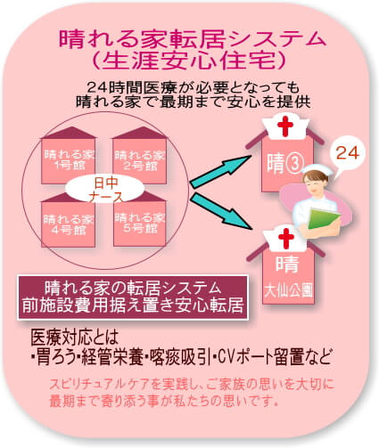 【2015年】晴れる家3号館オープン時より、従来の晴れる家にご入居の方が、医療依存度が高まった時に、24時間のナーシングホームである晴れる家3号館に転居いただくシステムを導入いたしました。その後「転居システム」は晴れる家シリーズの「生涯安心住宅」となりご利用いただいています。